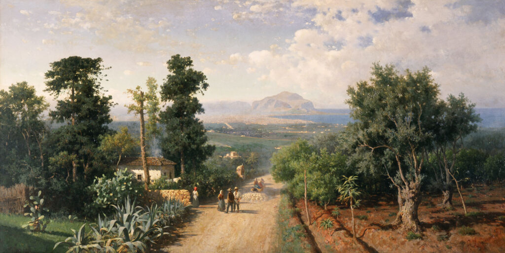 Sotto un luminoso cielo d’estate velato da gruppi di nubi, si sviluppa la Veduta di Palermo di Francesco Lojacono, che descrive la forza del colore del giardino mediterraneo della celebre Conca d’Oro, che dolcemente inclina fino alla costa della città di Palermo e al suo golfo, chiuso a ovest da Monte Pellegrino.