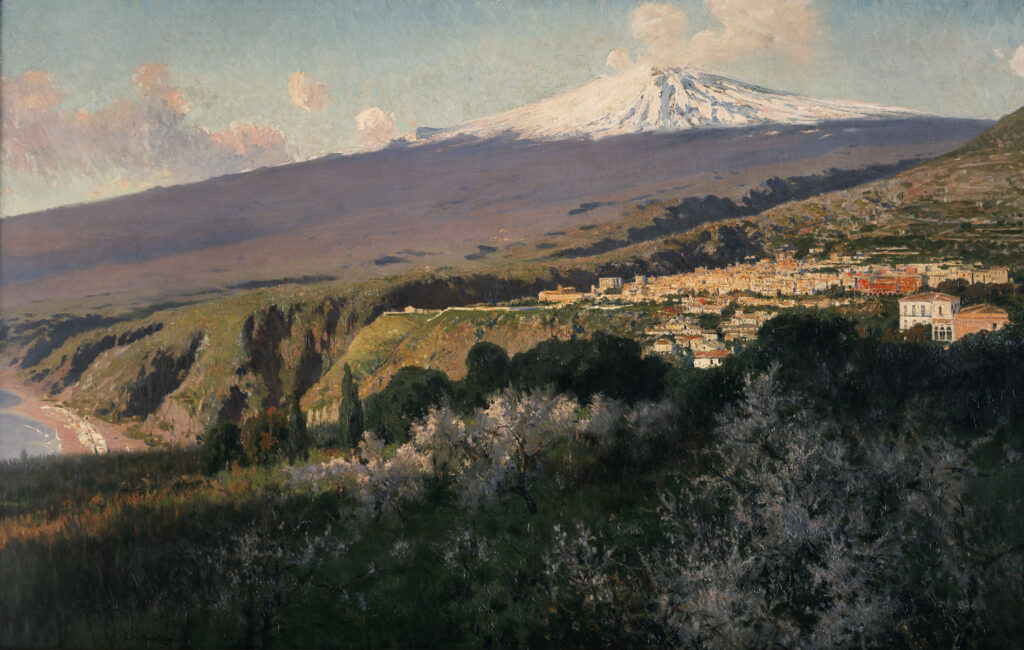 Alla Biennale di Venezia nel 1907 presentò Taormina, tela monumentale che ritrae un paesaggio primaverile d’intensa vitalità. Sullo sfondo osserviamo l’Etna innevato e i colori esaltati dalla luce calda e dorata.
